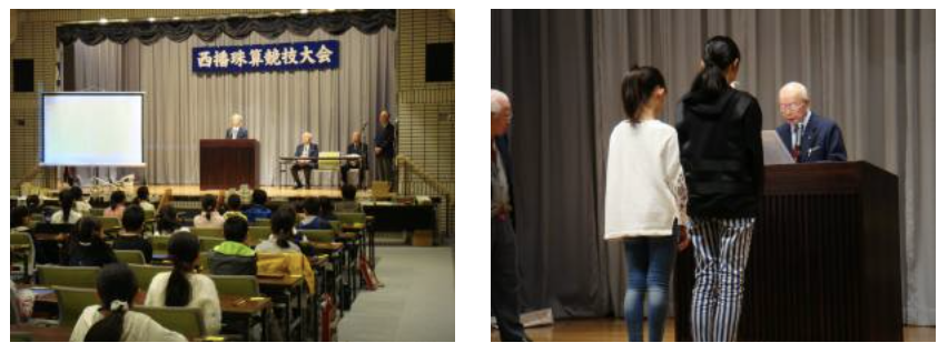 幼稚園児から高校生まで108名の参加者が個人総合競技・読上暗算競技・読上算競技・フラッシュ暗算競技を競い、個人総合競技 小学生の部 優勝 岸本萌花さん(揖西東小5年)、中学生以上の部 優勝 小松千紗都さん(姫路商業高2年)に神戸新聞杯が授与されました。