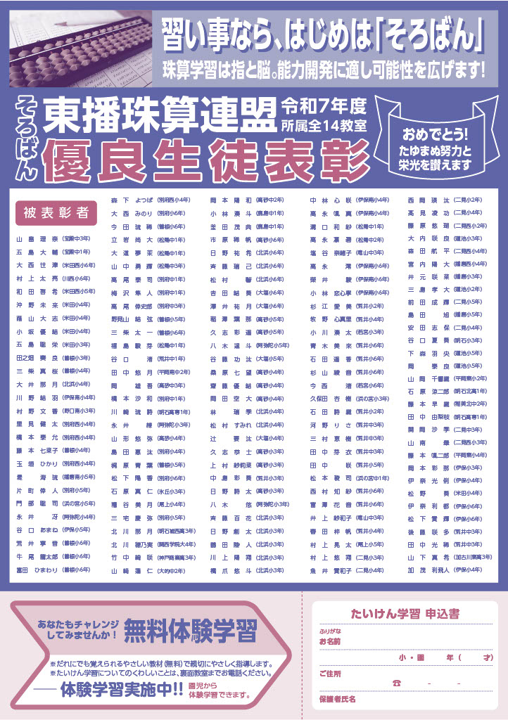 ~R7年度 東播珠算連盟・優良生徒表彰~