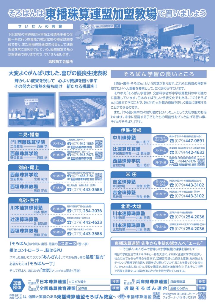 令和七年度、東播珠算連盟の優良生徒表彰が3月20日の春分の日に行われ、小学生から大学生まで141名の生徒さんが栄誉に輝きました。